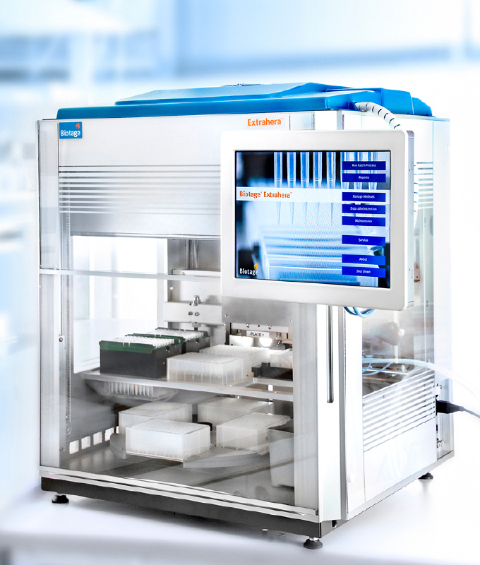 Biotage® Extrahera™ 是为专业分析人员推出的一款全新的系统。它是一款紧凑的八通道自动化仪器;快速、灵活和以用户为中心的设计,结合我们的应用方案以及一系列创新的样品前处理耗材,使得Extrahera成为您样品前处理的理想解决方案。系统执行一个标准的SPE方法来处理一块96孔板用时不到30分钟,包括样品预处理、活化、平衡、上样、清洗和洗脱步骤。独特的双模式设计让Extrahera成为分析实验室非常有吸引力的选择。96孔板,或者小柱,由您决定。
